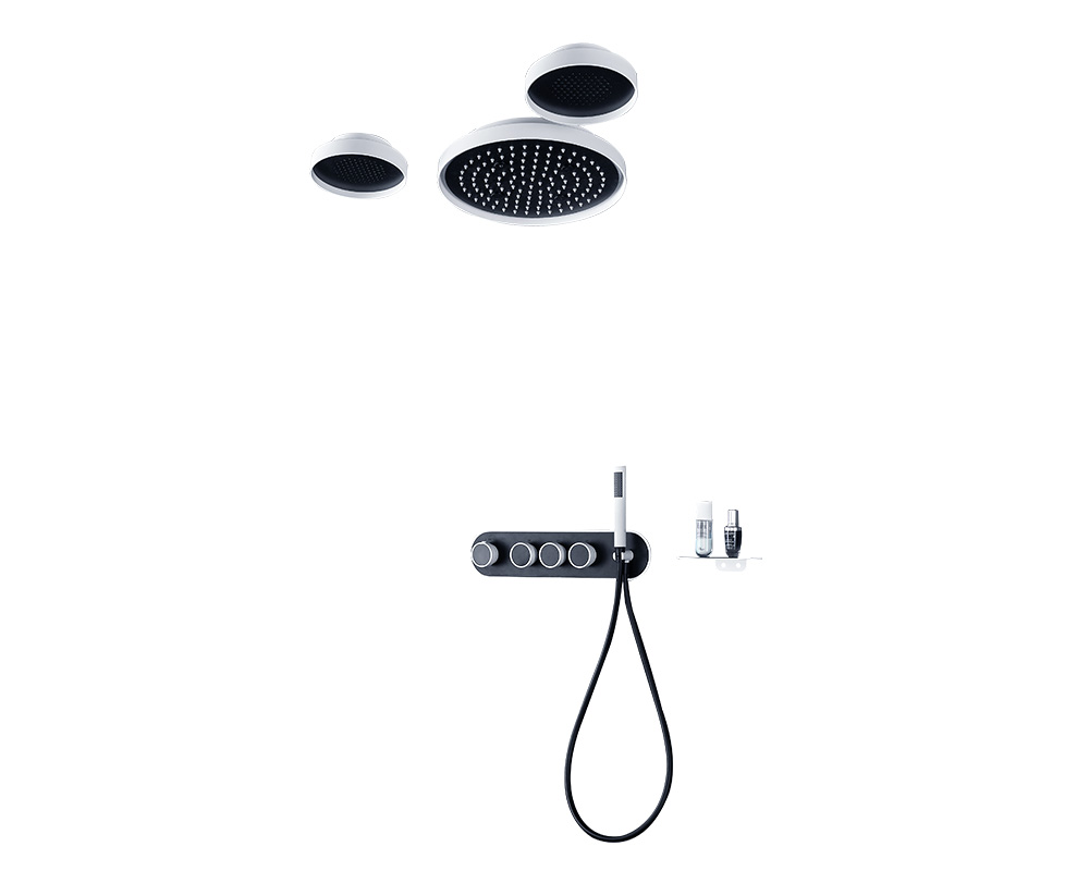 2-function stainless steel top shower LED light Blue tooth 3-function thermostatic mixer Brass shower holder Brass hand shower PVC shower hose Shelf
